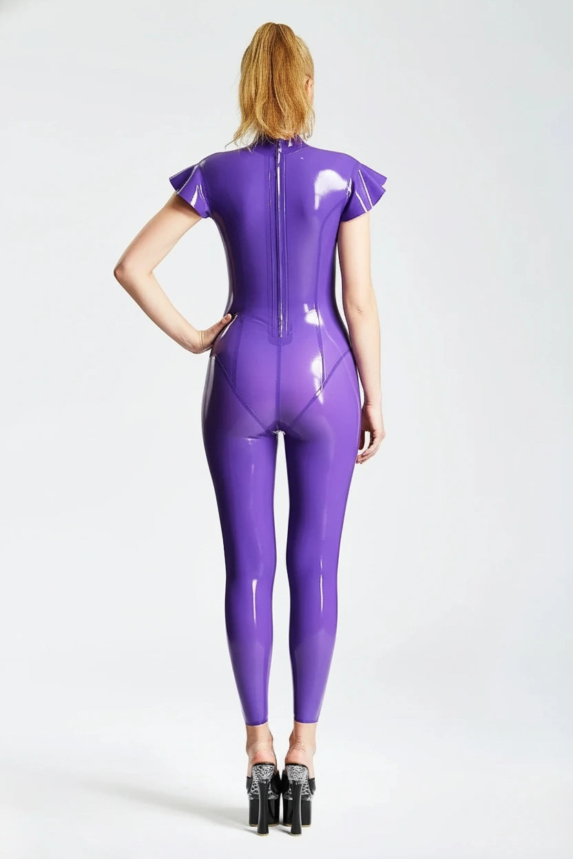 This elegant and vibrant catsuit in Purple is designed to make a bold fashion statement. The suit features a small, low V-neckline that adds a touch of allure while maintaining sophistication. Distinctive lotus-style sleeves provide a unique flair, enhancing the overall aesthetic with their decorative edges. The catsuit adheres closely to the body, crafted from a 0.4mm thick latex, ensuring both comfort and durability. A central back zipper simplifies the process of slipping into the suit, complemented by leotard-style seam shapes that accentuate the natural curves. This piece is ideal for those who desire a combination of high fashion and practicality.