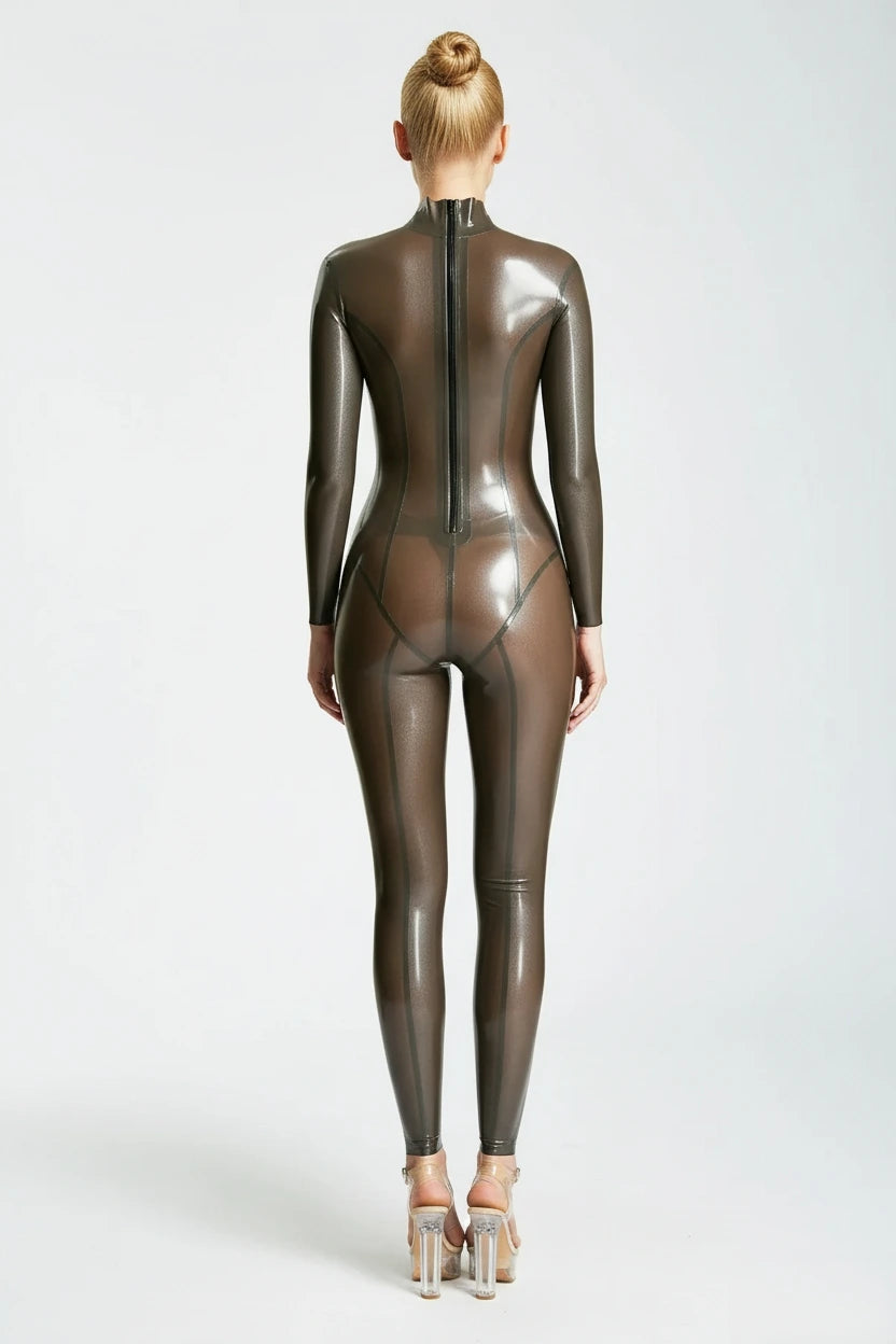 The SKU88 latex catsuit delivers a stunning combination of elegance and bold design, perfect for making a statement. Made from high-quality Metallic Platinum latex, this figure-hugging catsuit features a **big keyhole front**, beautifully framing the chest area, and a high-neck collar that adds a touch of sophistication. The leotard-style seaming enhances the silhouette, creating a visually striking effect. For easy wear, it is equipped with a **1-way back zipper until waist and no crotch zipper**, ensuring both practicality and style. This design is perfect for fashion enthusiasts looking for a balance of elegance and utility.